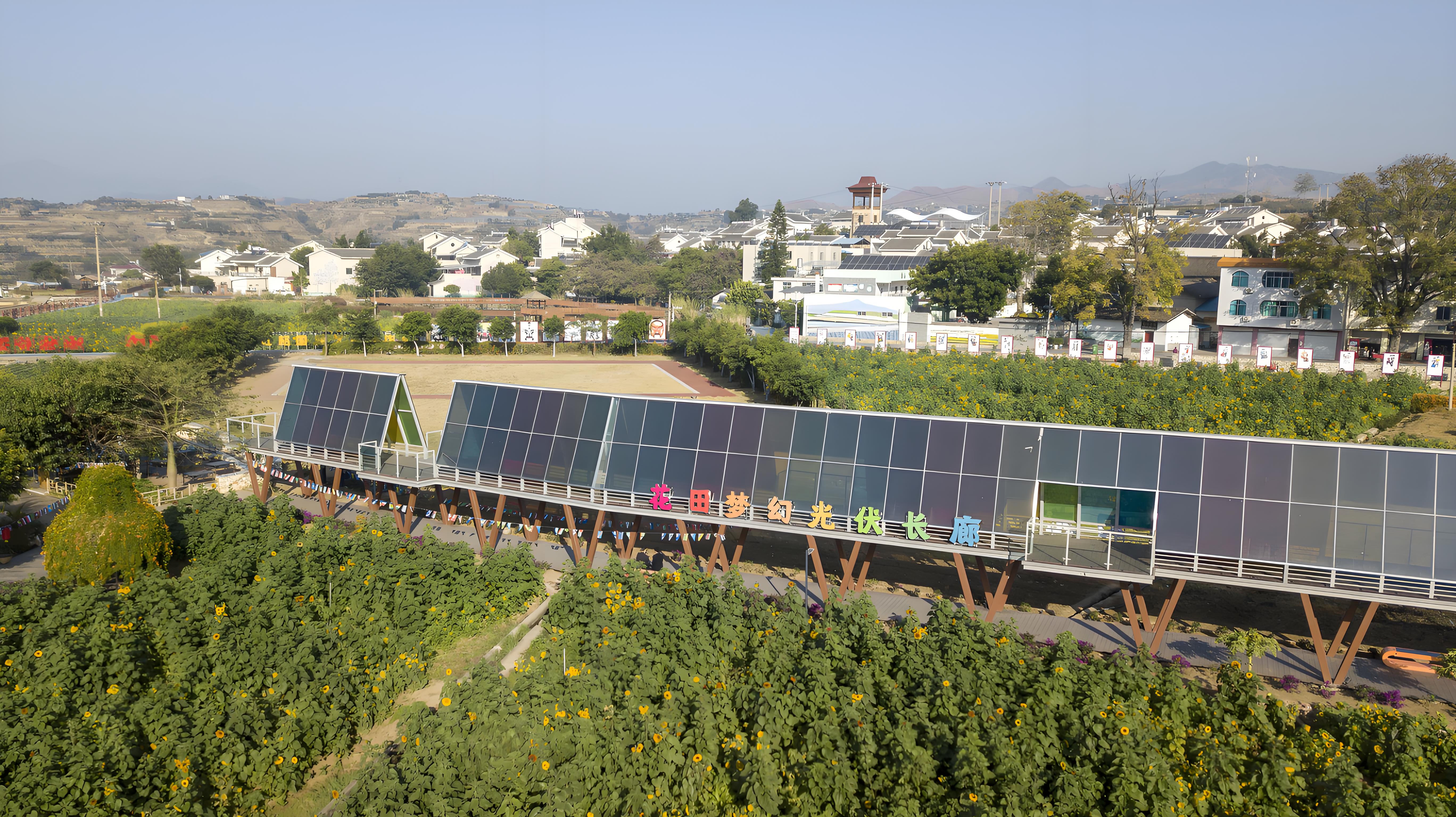 花田梦幻光伏长廊位于四川省攀枝花市盐边县红格镇,用“分布式光伏+风貌提升+低碳示范”的方式,进一步丰富城市更新,为区域生产生活提供绿色可持续清洁能源。目前该区域已完成智慧能源站、智慧光伏停车场、光伏休闲广场、零碳智慧立体植物工厂、零碳陆基循环渔业应用、田园彩虹光伏观景长廊等多个清洁能源项目,全方位展示了“光伏+农业”应用场景。
