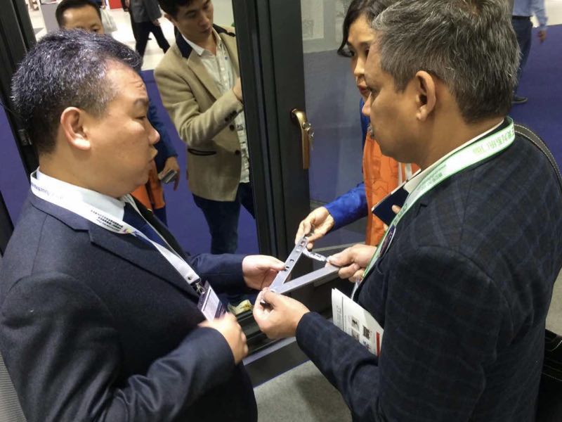 参展商向外国观众介绍新专利产品——窗用隐藏式齿轮铰链