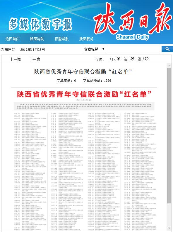 陕西日报2017年11月25日刊发《陕西省优秀青年守信联合激励“红名单”》,公司总裁丁晔荣耀上榜。